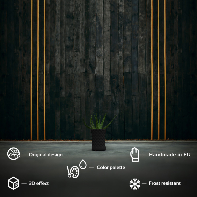 Let yourself be invited to the world of amazing, non-obvious designs! Poly No2 6 cm Black Matt is an extraordinary concrete pot that will liven up the space around you. Its slim, elongated silhouette is completely unlike any traditional flowerpots’ and the three-dimensional pattern added to the surface only serves to improve its unique elegant look. The combination of soft, curved lines with geometric embossing makes it difficult to ignore.