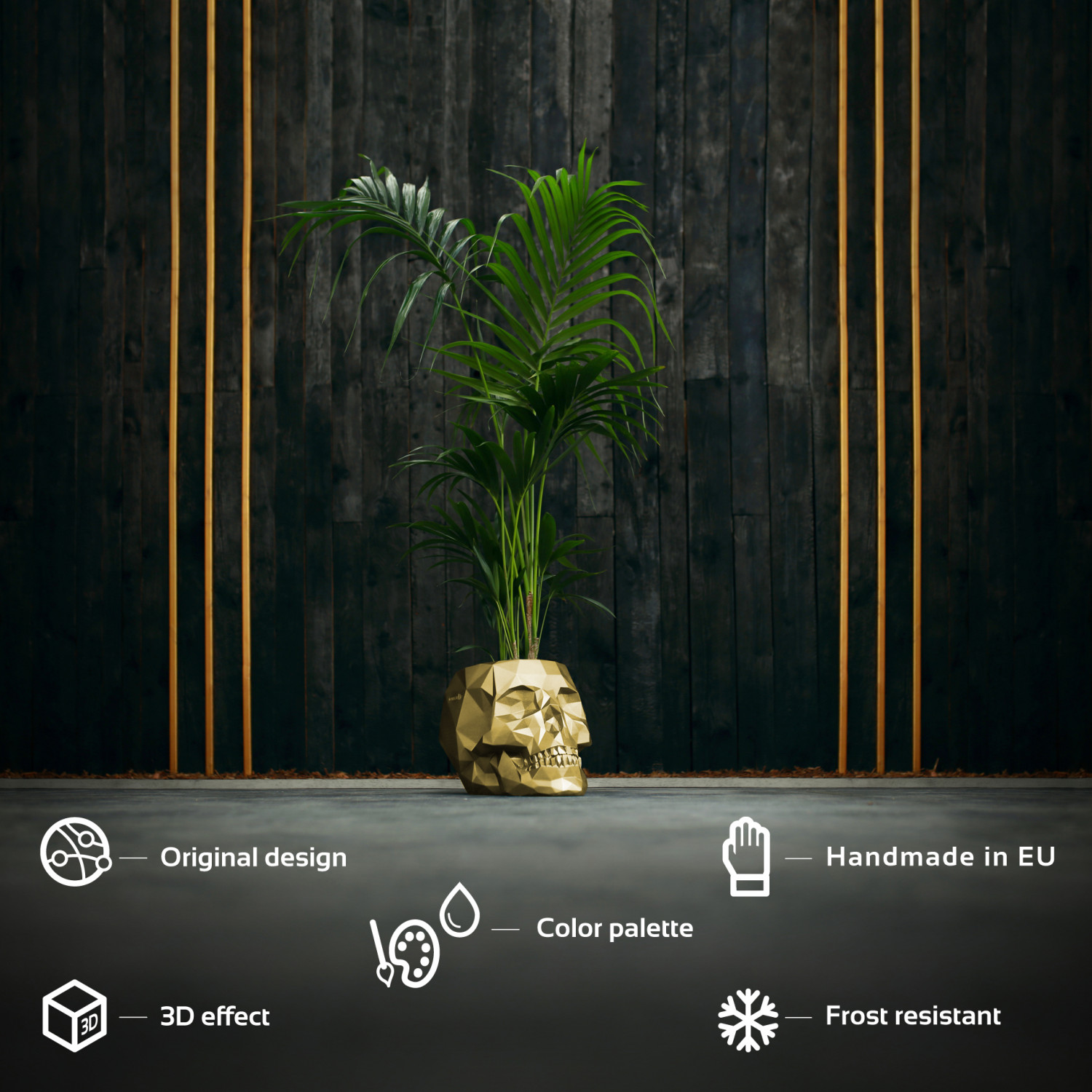 This is definitely a project only for those who do not care about conventions. A skull cast from architectural concrete could be deemed quite gruesome, but contrary to assumptions, it looks rather humorous. We simplified its shape, turning it into a geometric block – as a result, it looks very modern. The combination of such a shape with extremely fashionable architectural concrete creates a designer piece that perfectly complements the decor of various architectural styles - from industrial, eclectic or minimalistic to glamour. Classic Gold is a finish that perfectly emphasizes the design’s modern line, but you can also choose from many other colouring variants.