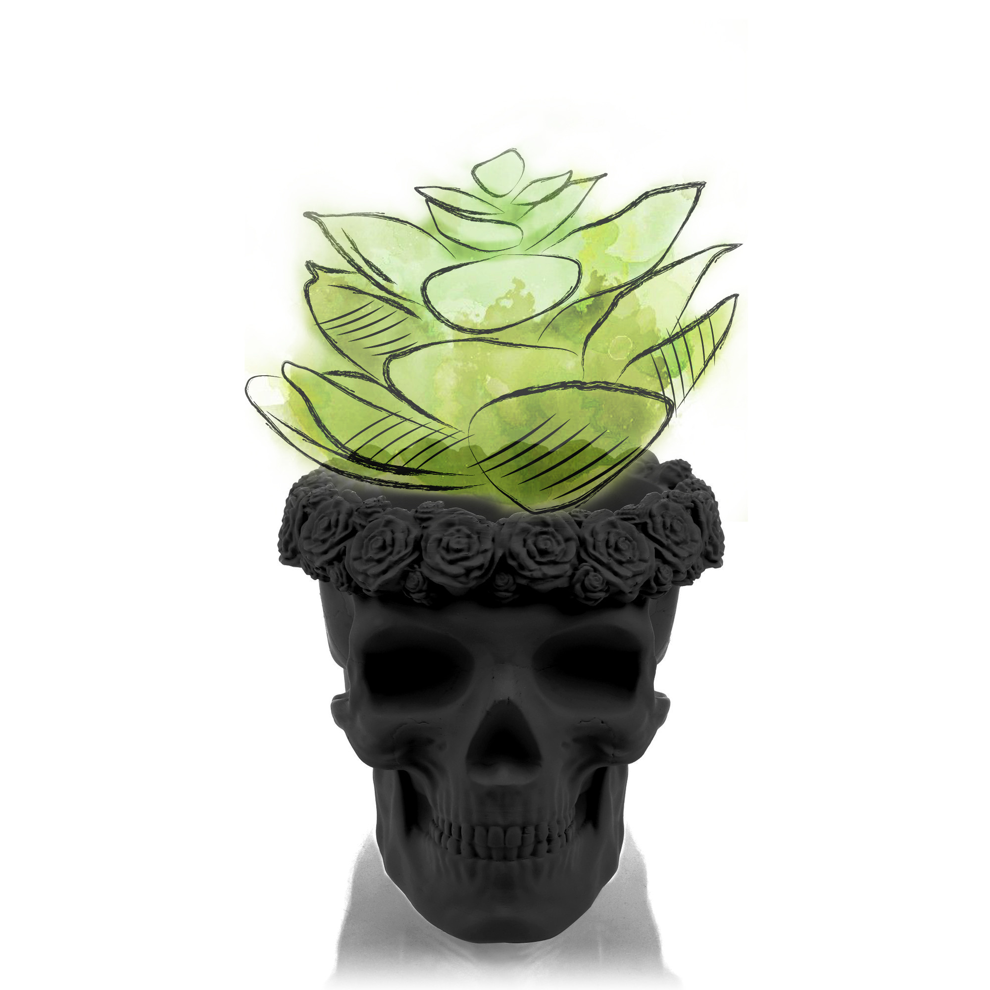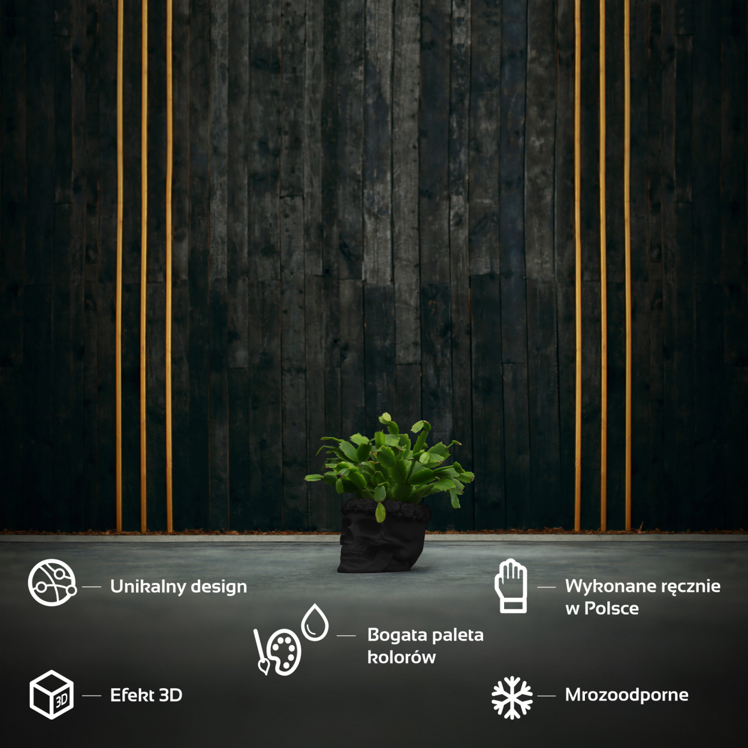 To donica łącząca designerski materiał, jakim jest beton architektoniczny, z nietuzinkową bryłą. Realistycznie odwzorowaną czaszkę postanowiliśmy przybrać kwiecistym wiankiem, który zdecydowanie… ociepla jej wizerunek. To dekoracja, obok której nie da się przejść obojętnie. Jeśli chcesz zrobić wrażenie na gościach w swoim domu lub firmie, to doskonały wybór. To model przeznaczony do użycia jako donica lub osłonka, ale nic nie stoi na przeszkodzie, by wykorzystać go jako przybornik na długopisy lub pojemnik na drobiazgi. Wybór należy do Ciebie!